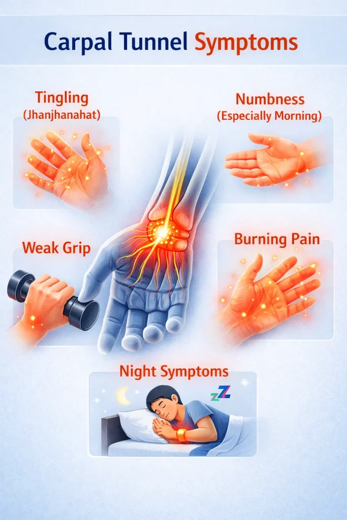 In Hindi, carpal tunnel syndrome in Hindi is often described as “haath ki nass dabna” – the compression of a nerve in the hand. The tingling and numbness patients describe – jhunjhuni in hand or jhanjhanahat – is the direct result of this nerve compression.