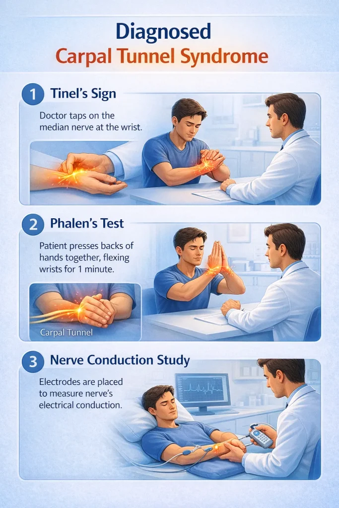 Doctors diagnose CTS using physical tests like Tinel’s and Phalen’s tests, along with nerve conduction studies to confirm severity.