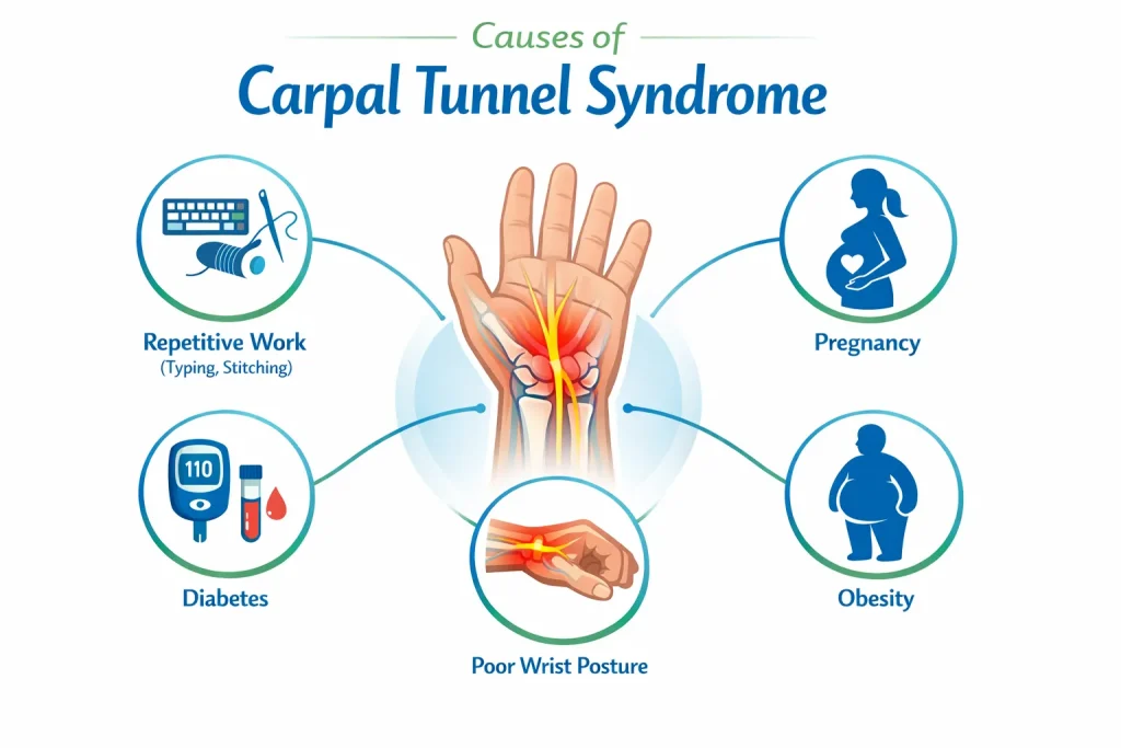 Common causes include repetitive hand movements, poor wrist posture, pregnancy, diabetes, and inflammation of tendons inside the wrist.