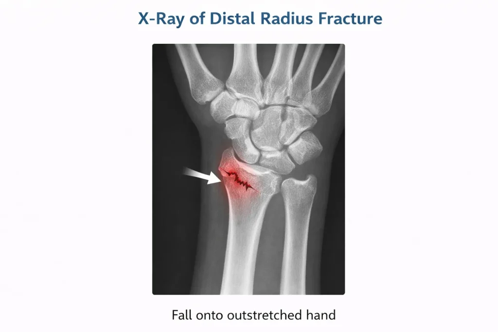 Doctors diagnose distal radius fractures using wrist X-rays, typically taken in AP and lateral views. These images reveal fracture location, displacement, joint involvement, and bone alignment, helping physicians determine whether the injury requires casting or surgical fixation.