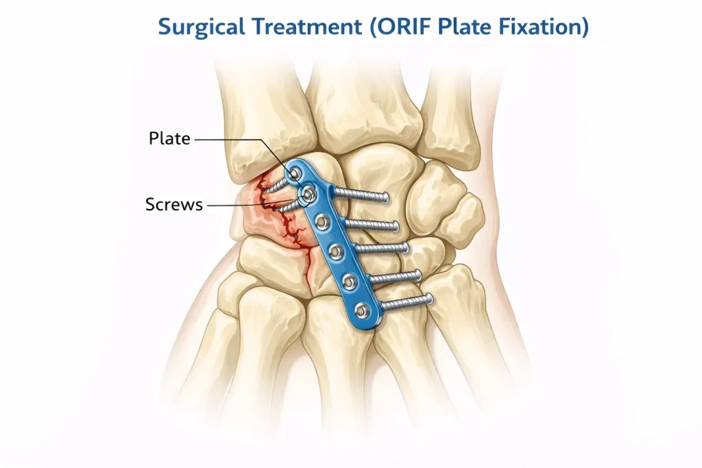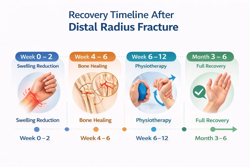 Recovery after distal radius fracture surgery usually takes around 3 to 6 months, depending on fracture severity, surgical fixation method, and rehabilitation. Bone healing typically occurs within 6–8 weeks, but full wrist strength and mobility return gradually with physiotherapy and regular exercises.