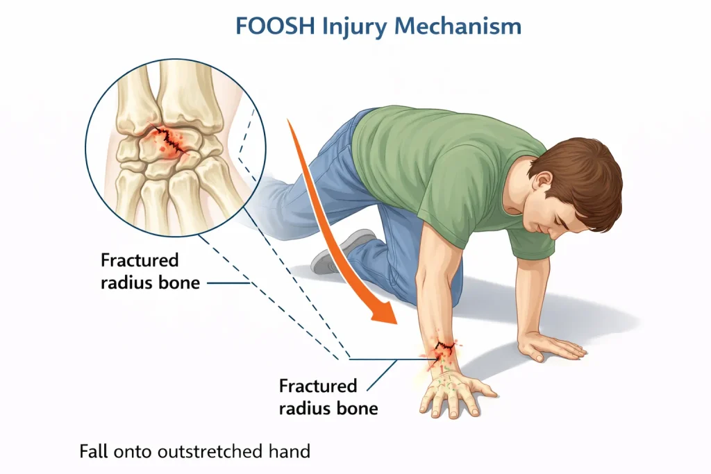 This is the leading cause of distal radius fractures. When someone falls forward, the instinctive reaction is to extend the hands to break the fall, placing stress on the wrist.
