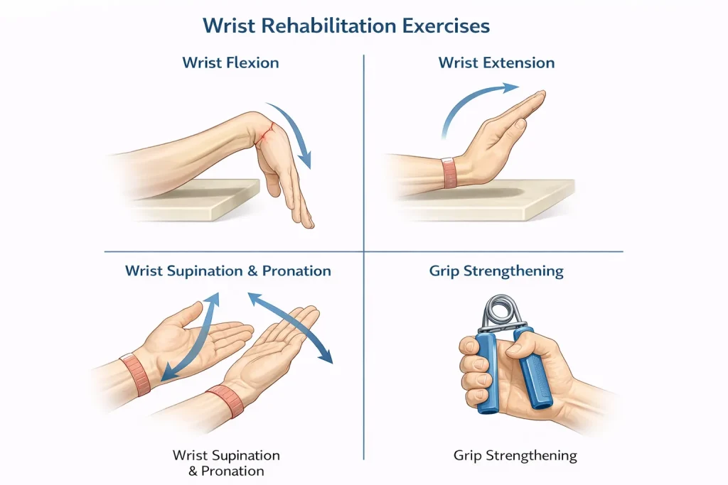 Rehabilitation exercises may include wrist flexion and extension movements, forearm rotation exercises, grip strengthening, and finger mobility drills. These exercises help restore wrist flexibility, improve circulation, and rebuild strength after cast removal or surgery.