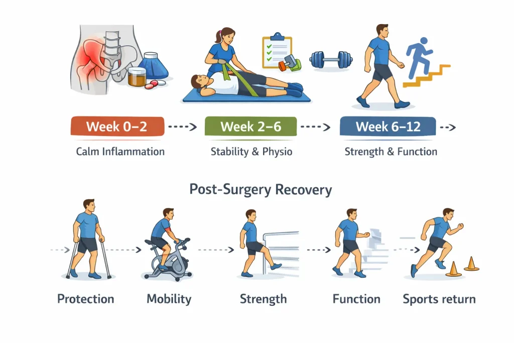 Many people improve within 6 to 12 weeks using rest and physiotherapy. Recovery depends on tear size, activity level, and hip stability. Some take longer, especially if the hip joint has bone impingement or repeated twisting movements.