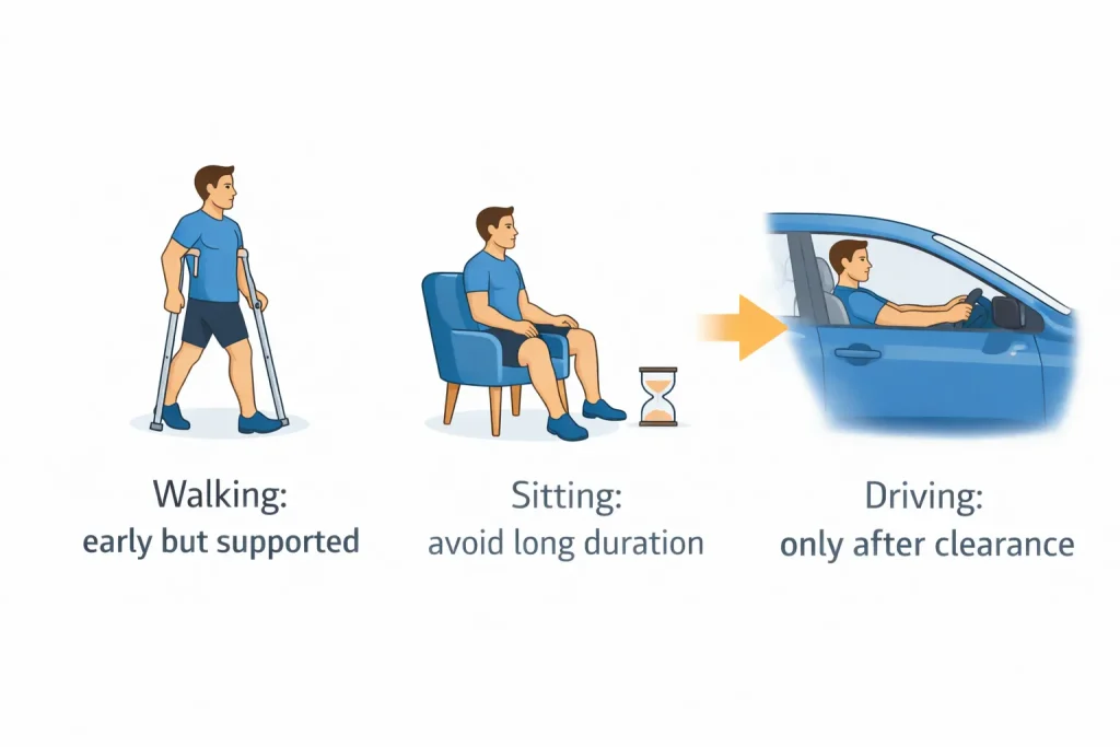 Most patients can walk with crutches early after surgery, depending on the surgeon’s advice. Walking without support takes time and happens step by step. The goal is stable, pain-free walking, not fast walking, in the first few weeks.