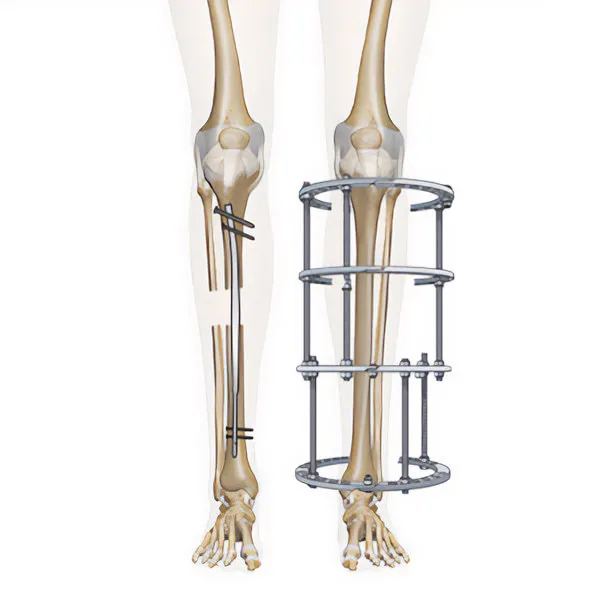 During the surgery, the bone is surgically cut and fitted with a metal ring fixator secured using thin wires and pins. Over time, the frame is adjusted gradually (usually around 1 mm per day) to separate the bone segments. This slow separation stimulates new bone formation in the gap, which then consolidates to form a healthy, stable structure.