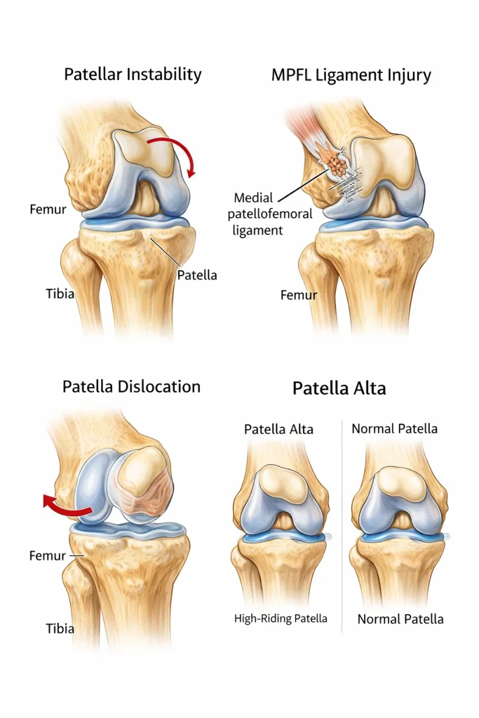 Patella alta means the kneecap sits higher than normal. It increases the risk of instability and recurrent dislocation.