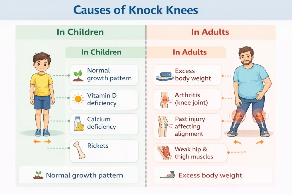 Knock knees in adults can develop due to weight gain, weak hip muscles, flat feet, old injuries, or early arthritis. Over time, these factors can change walking posture and push the knees inward during daily movement.
