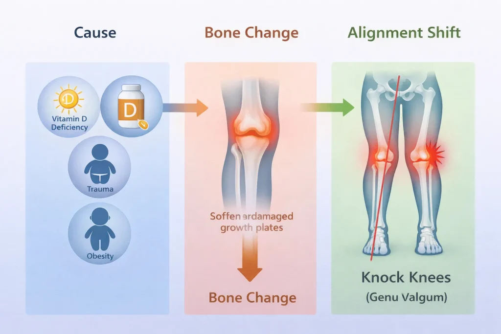 Knock knees occur when the mechanical axis of the lower limb shifts outward, causing excessive inward angulation at the knees. In a normally aligned leg, body weight passes evenly through the hip, knee, and ankle. In genu valgum, this balance is disturbed, leading to abnormal stress on the knee joint, particularly the outer compartment.