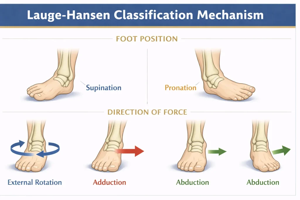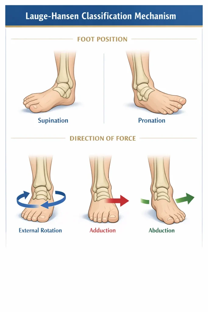 The Lauge-Hansen classification is a mechanism-based system used to describe ankle fractures. Unlike the Weber classification, which focuses on the level of fibular fracture, the Lauge-Hansen ankle fracture classification explains how the injury occurred, based on foot position and direction of deforming force.