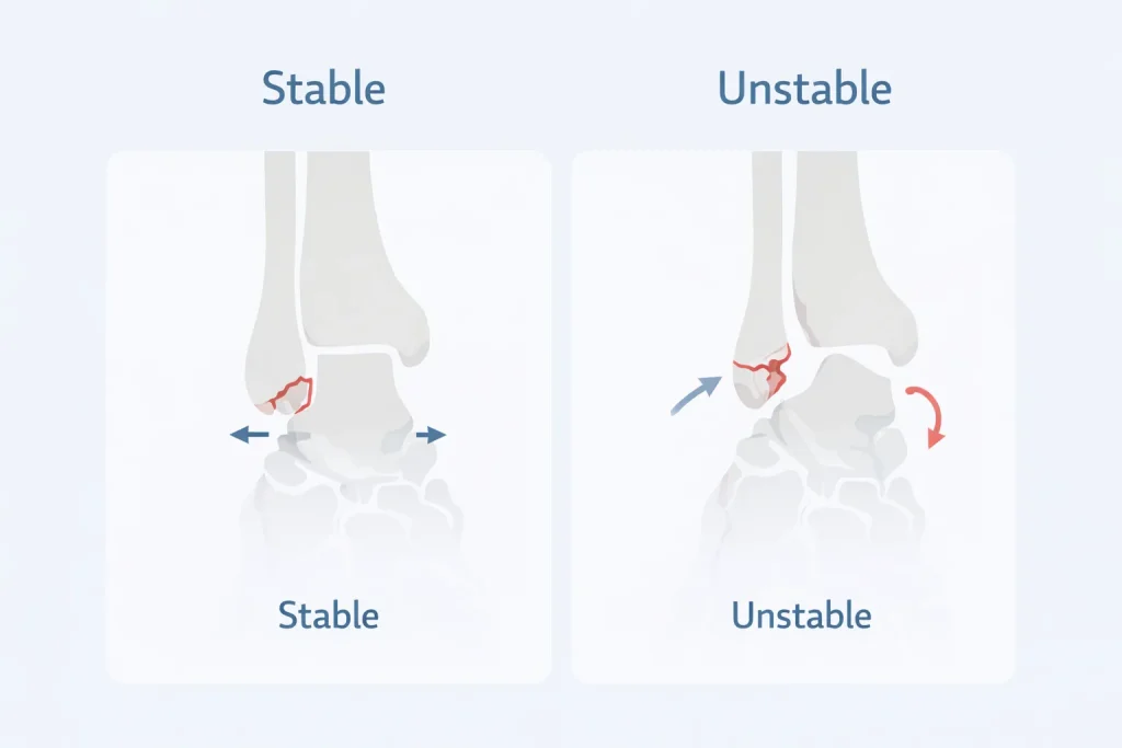 The severity depends not only on the fracture line but also on ligament injury and joint alignment. Even a small displacement can make the ankle unstable.