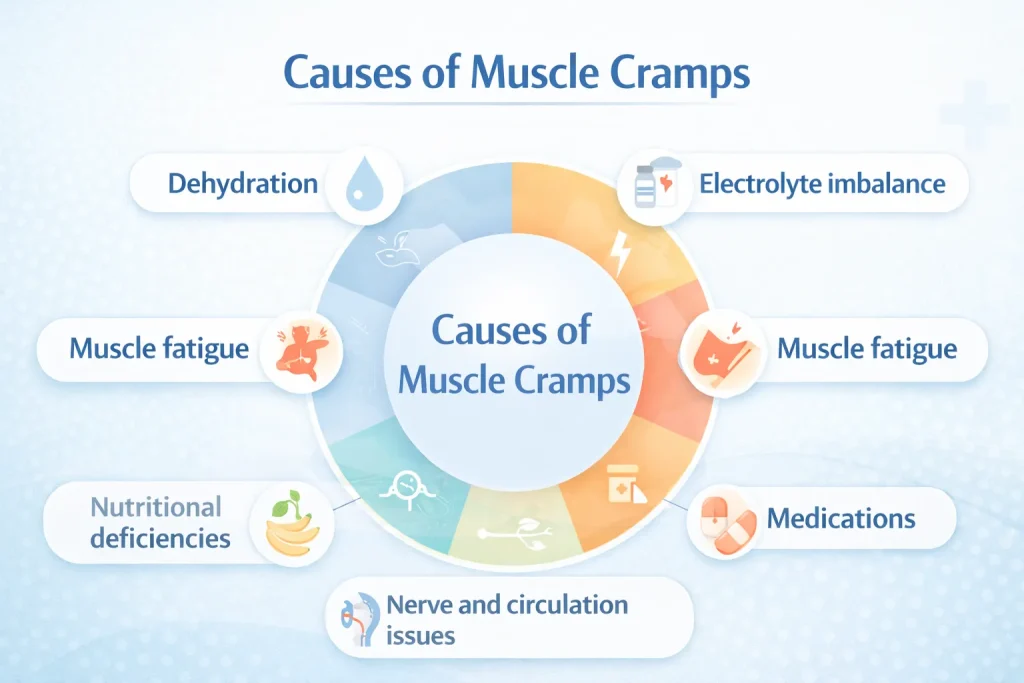 Common causes include dehydration, electrolyte depletion (potassium, magnesium, calcium), muscle fatigue, poor conditioning, medication side effects, nerve compression, and age-related muscle loss.