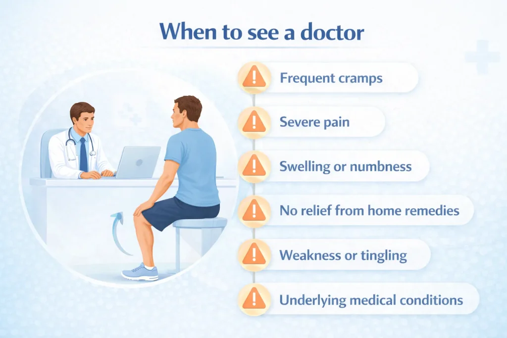 When to See a Doctor: Seek medical care if cramps are severe, happen frequently without a clear cause, do not respond to home treatment, or come with numbness, weakness, or swelling in the limb.
