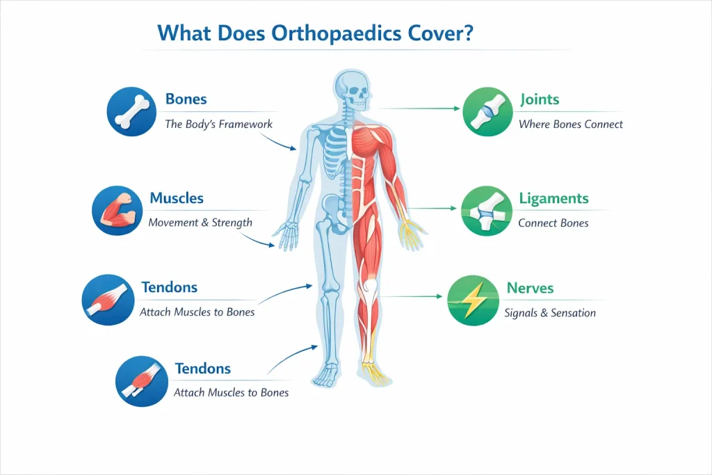 In simple terms, if the problem involves your bones, joints, muscles, or the tissues around them, orthopaedics is the right specialty.