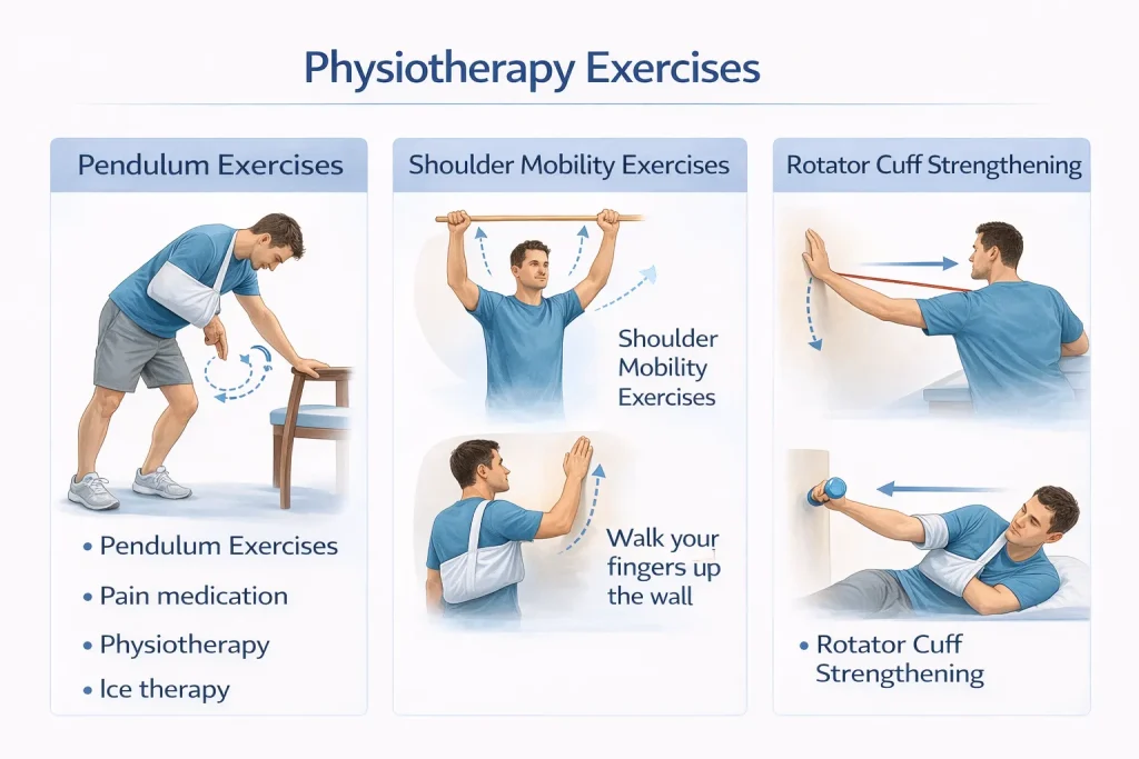 Recovery exercises usually include pendulum exercises, gentle shoulder range-of-motion movements, rotator cuff strengthening, and resistance training. These exercises help restore shoulder flexibility, improve muscle strength, and prevent stiffness after immobilization.