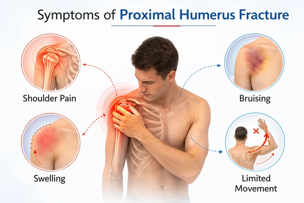 Common symptoms include severe shoulder pain, swelling, bruising, limited arm movement, and tenderness around the shoulder joint. Some patients may also experience deformity or difficulty lifting the arm following the injury.