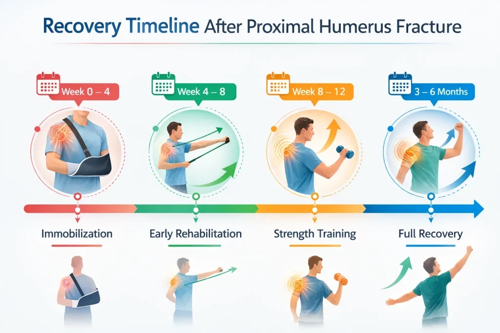 Recovery after proximal humerus fracture surgery typically takes 3 to 6 months, depending on fracture severity and rehabilitation progress. Bone healing usually occurs within 6–8 weeks, but restoring full shoulder strength and range of motion may require extended physiotherapy and gradual activity progression.