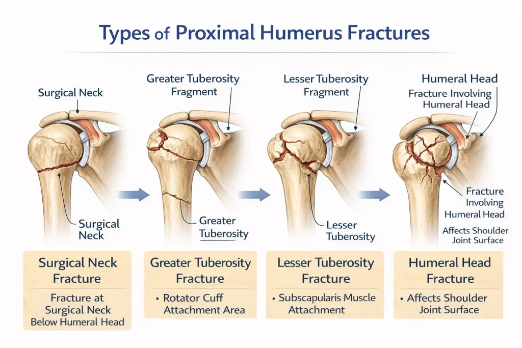 Proximal humerus fractures can range from minor cracks in the bone to complex multi-fragment fractures that disrupt the entire shoulder joint.