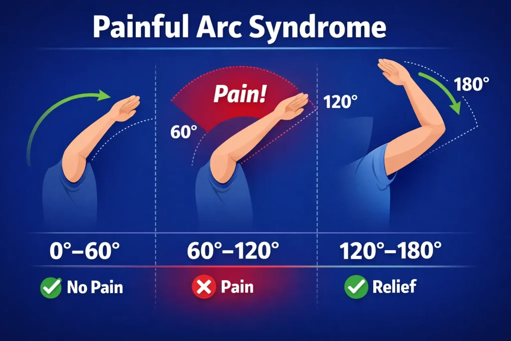 The painful arc in shoulder impingement typically appears between 60 and 120 degrees of arm elevation. Below 60 degrees, there is usually no pain because the tendon is not yet being compressed. Between 60 and 120 degrees, the pinching occurs and pain spikes. Above 120 degrees, the mechanics of the joint shift and the compression eases – so many people find the pain actually reduces again at full overhead elevation.