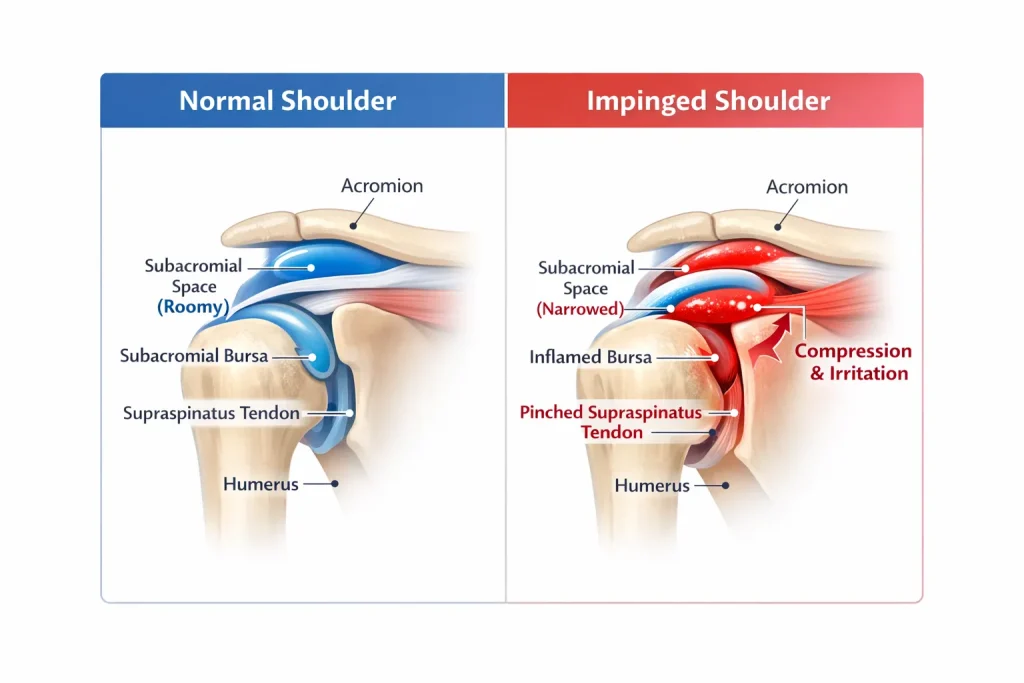 Shoulder impingement is a condition where the soft tissues inside the shoulder – primarily the rotator cuff tendons – get mechanically compressed between the bones during arm movement. This compression happens in the subacromial space, a narrow gap between the head of the upper arm bone and the acromion, which is the bony roof formed by the outer part of the shoulder blade.