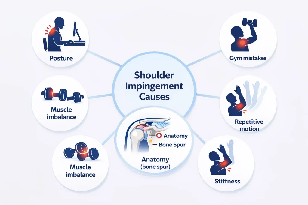 Shoulder impingement builds gradually through a combination of mechanical, postural, and lifestyle factors. It is rarely the result of a single incident. Identifying your specific cause is critical because without addressing it, symptoms will keep returning no matter how well you treat the pain itself.