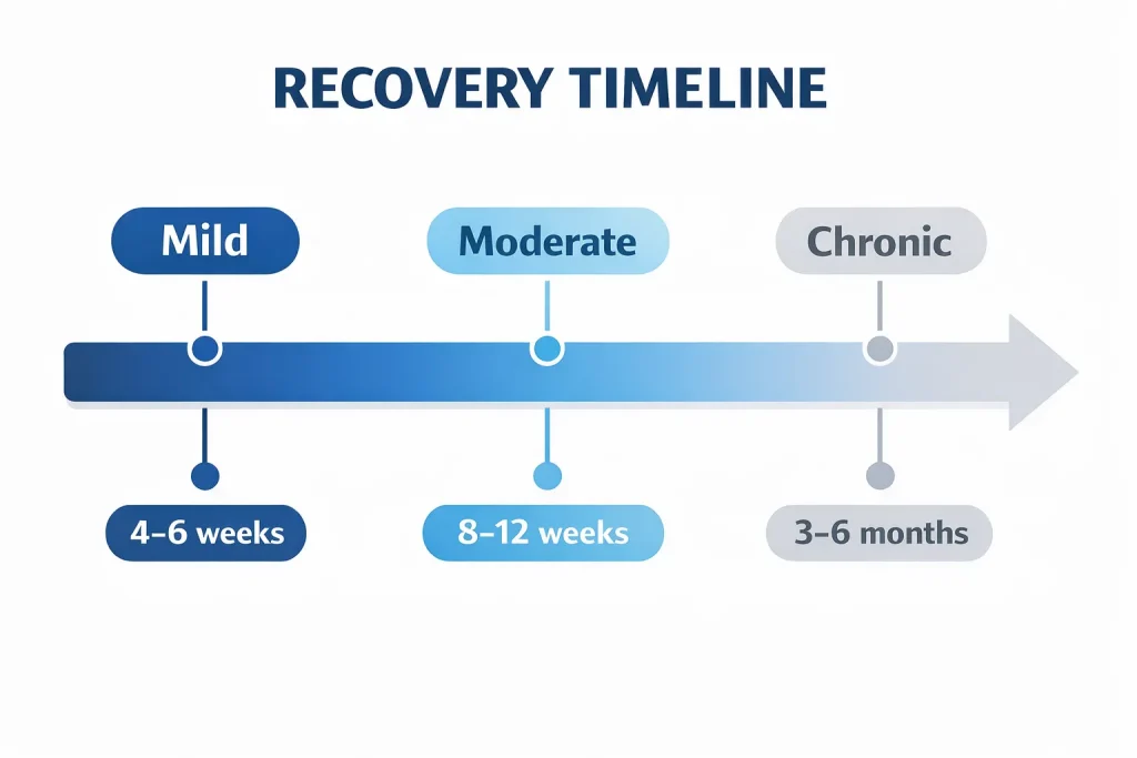 - Mild shoulder impingement caught early: 4 to 6 weeks with consistent self-care