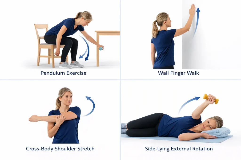 - Pendulum exercise: Lean forward over a table, let the affected arm hang freely, and make small, gentle clockwise and counterclockwise circles using gravity rather than muscle effort. One to two minutes, twice daily