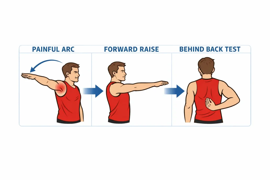 Painful arc test: Slowly raise your arm out to the side from your body. Note exactly where pain begins and ends. Pain that appears between 60 and 120 degrees of elevation and then reduces above that range is the defining sign of shoulder impingement syndrome.