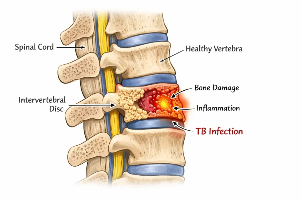 Back pain is common. Almost everyone gets it at some point. But sometimes, back pain is not “just back pain.” Sometimes it is a warning sign of something deeper happening inside the spine. One of the most serious causes is Spinal Tuberculosis, also known as TB Spine or Pott’s Disease. Spinal TB is not as rare as people think, especially in countries where tuberculosis is common. And the tricky part is this: it can start slowly, like mild back pain and tiredness. Many people ignore it for weeks or months. So in this blog, we will cover everything you need to know about Spinal Tuberculosis (TB Spine):