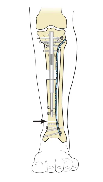 - Bone transport (Ilizarov technique) where new bone is gradually generated.